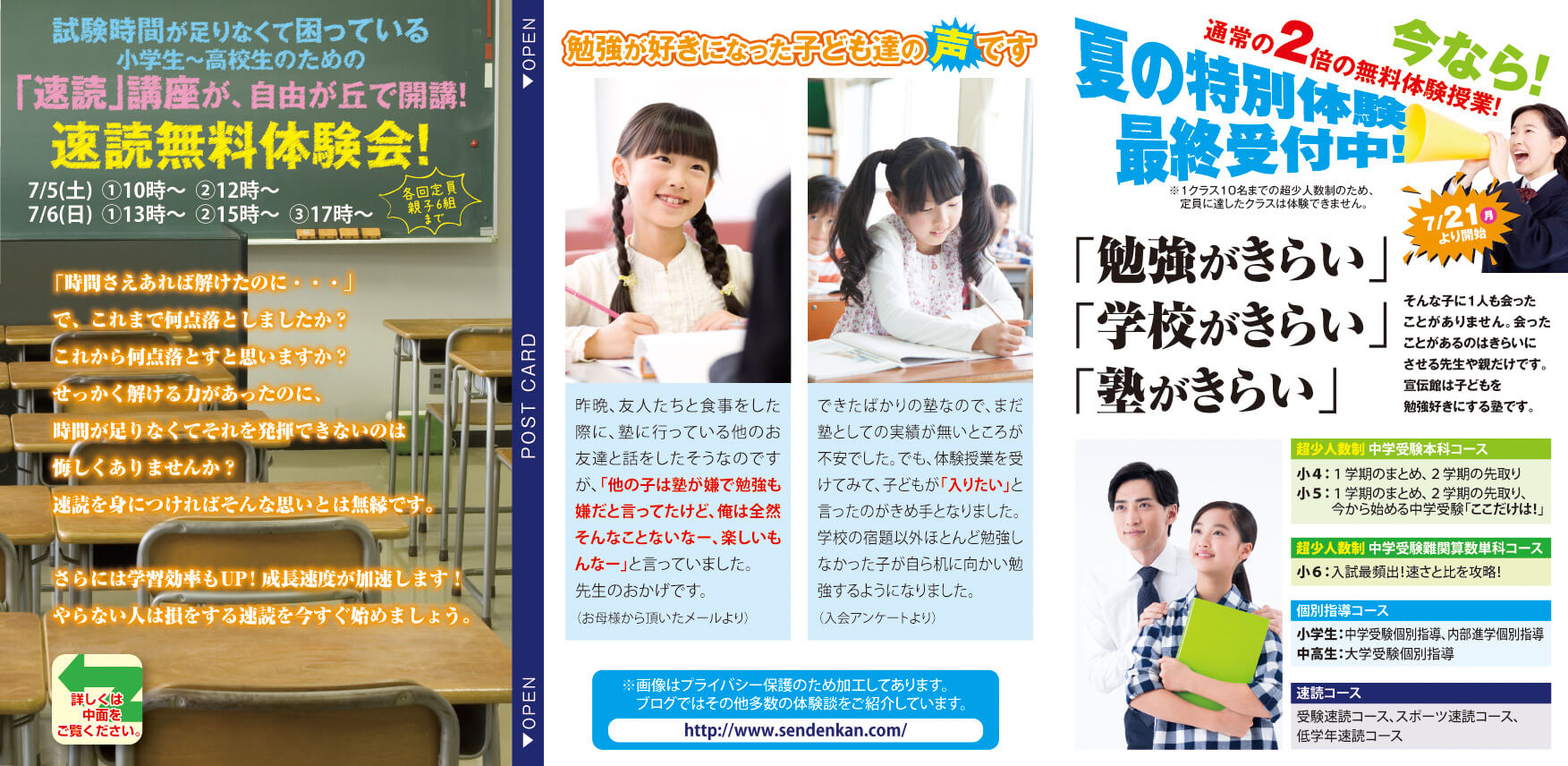 メインのキャッチコピーと合うように写真を選定、配置し口コミでの紹介が多い塾を表現しています。また、塾のアピールポイントは手書き風に親近感、推しの特典部分は目立つ色でデザインしました。